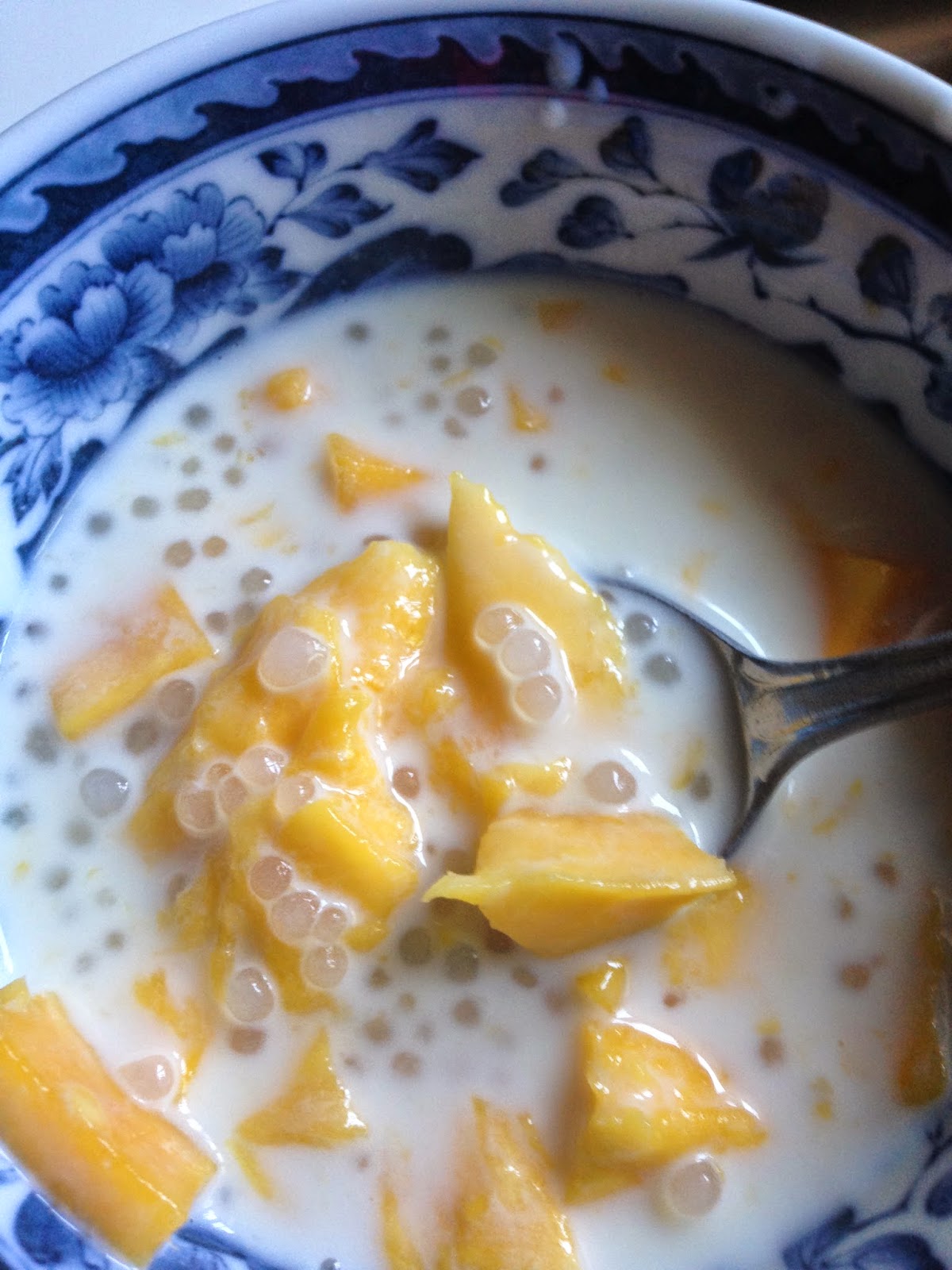Last, add drained and cool tapioca and mango cubes, stir, and serve. If you like it cold, leave in fridge before serving. Delish!!